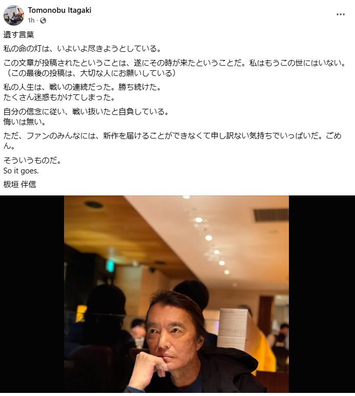 板垣伴信氏のFacebookアカウントにて10月16日、同氏が逝去していたことが明かされた。