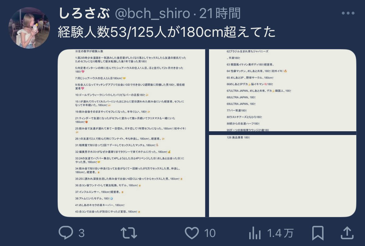 『180儖焚爾和切り』とか言っておきながら180経験人数の半分以下なの草