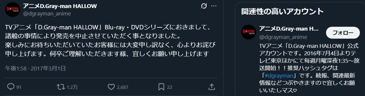 一連のツリー読んだが、他作品ネタを監督や重役が悪ノリで入れようとするのくだりで銀魂かな?と思った。しかし、Dグレ二期が濃厚なのかぁ。私は見ていないが、声優一新で非難轟々だったよね。当時相互フォローだった人が荒れまくっていたのを覚えている。DVD/BD発売中止って一体何があったんだろう。 https://t.co/3CiQZXImHY
