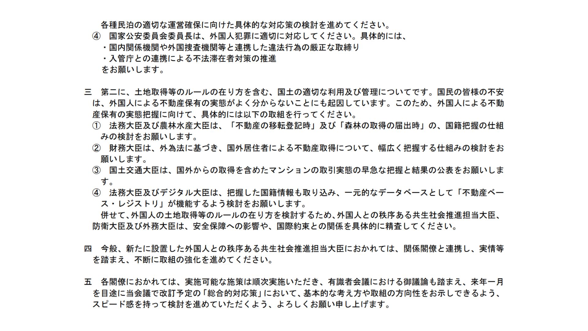 関係閣僚におかれましては、外国人との秩序ある共生社会の実現に向けて、第一に、既存のルールの遵守・各種制度の適正化に向けた取組、第二に、土地取得等のルールの在り方を含む国土の適切な利用及び管理に向けた取組を進めてください。
