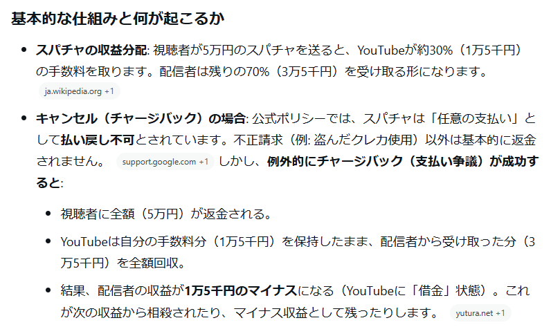 本来スパチャのキャンセルは出来ないようになっている為、なんらかの理由で返金対応してしまうカード会社とYoutubeのシステムが最悪の形で噛み合ってるっぽい