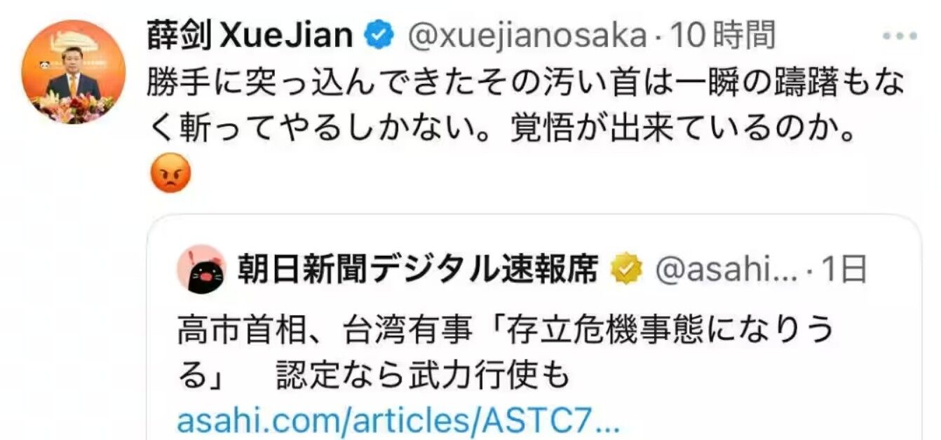 中国の薛剣(せつけん)駐大阪総領事は8日、朝日新聞デジタル速報席がX(旧ツイッター)に投稿した記事「高市首相、台湾有事『存立危機事態になりうる』 認定なら武力行使も」を引用し、自身のXアカウントに「勝手に突っ込んできたその汚い首は一瞬の躊躇もなく斬ってやるしかない。覚悟ができているのか」と書き込んだ。