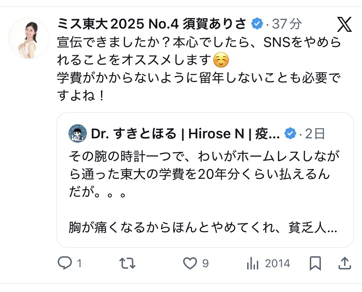 — ミス東大2025 No.4 須賀ありさ (@misstodai4) December 15, 2025
