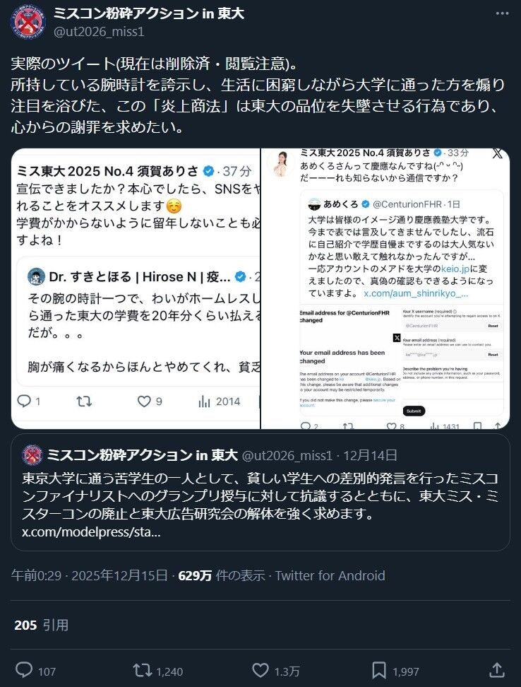 — ミスコン粉砕アクション in 東大 (@ut2026_miss1) December 15, 2025