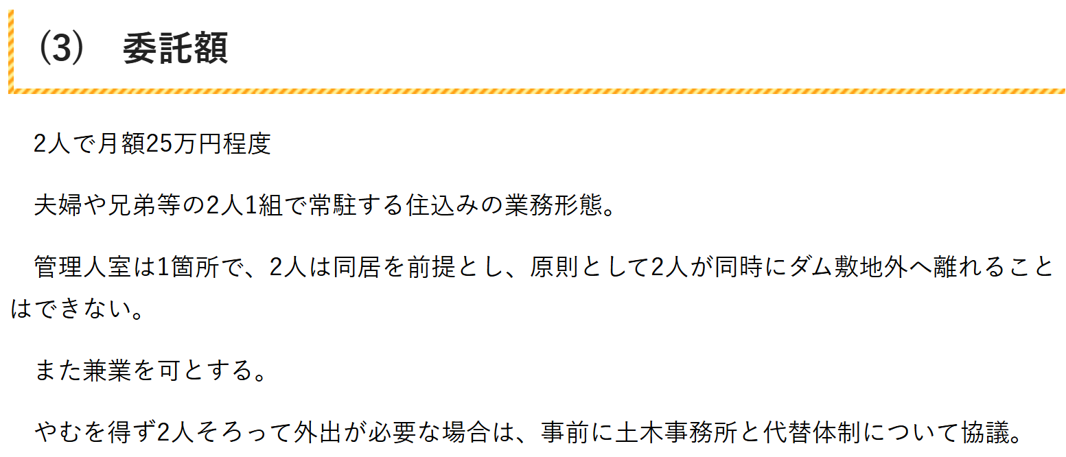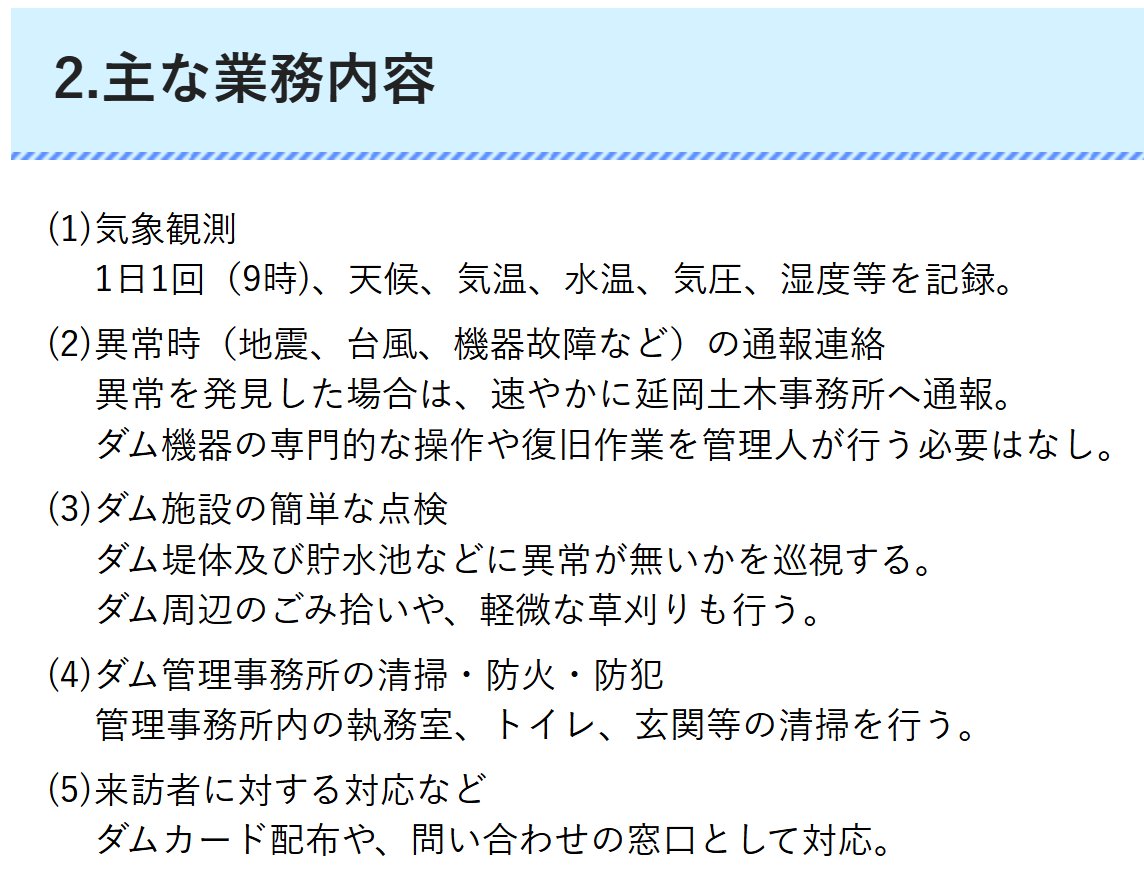 「異常時の通報連絡」って実質24時間体制だし、ある程度の規模のダムの巡視と「周辺のごみ拾いや軽微な草刈り」って結構な作業量になりそうな気が。