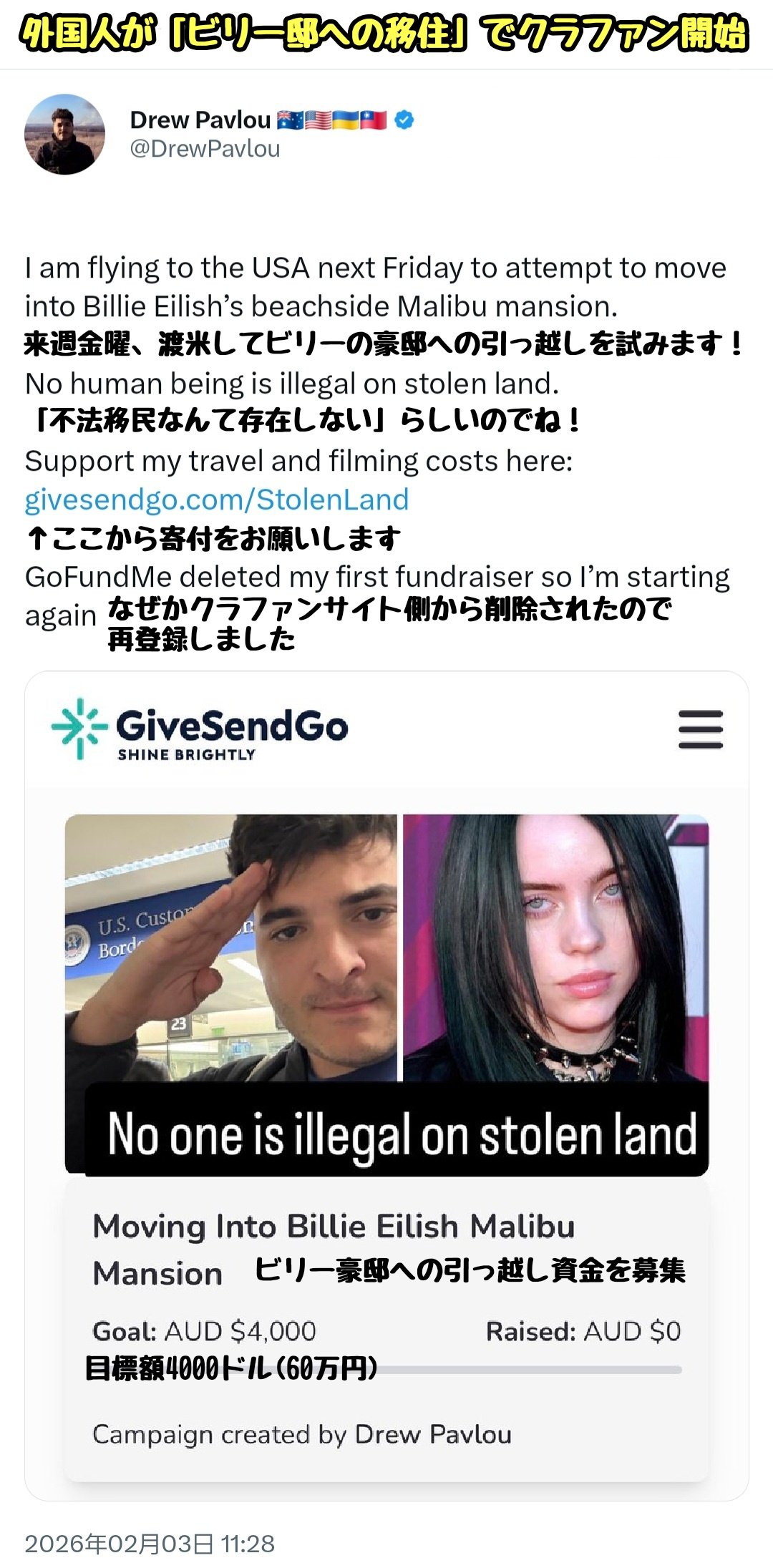 【追記】なお、あるオーストラリア人男性が「アメリカには不法移民なんて存在しない?よっしゃ、わかったわ!!」と、ビリー・アイリッシュの豪邸へ無理やり引っ越すための資金をクラファンで募集し、かなりの金額を集めることに成功するもクラファンサイト側から募集を強制削除される事件も起きてます https://t.co/GW6RitFSQx pic.twitter.com/sogvrxdCoO