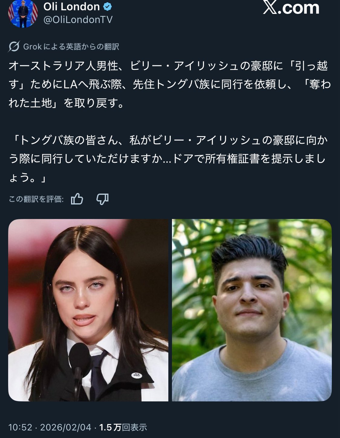 「トングヴァ族の皆さん、私がビリー・アイリッシュの豪邸に向かう際に同行していただけますか...ドアで所有権証書を提示しましよう。」